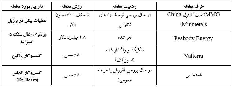 این تحقیقات که اولین بار توسط فایننشال تایمز گزارش شد، ناشی از شکایتی است که توسط CoreX Holding، یک گروه صنعتی جهانی و رقیب مستقیم در منطقه، ثبت شده است. Anglo در فوریه اعلام کرد که معادن نیکل خود در برزیل را بهMMG، یک شرکت فهرست شده در بورس هنگ کنگ که تحت کنترل شرکت دولتی China Minmetals است، خواهد فروخت. انتظار میرود این معامله در این فصل نهایی شود.