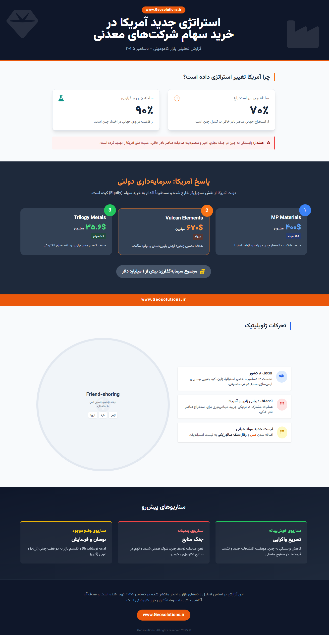 دولت ترامپ در طول سال گذشته، بیش از ۱ میلیارد دلار برای خرید سهام در شرکتهای مواد معدنی حیاتی سرمایهگذاری کرده است. معاملات اخیر شامل سرمایهگذاری ۴۰۰ میلیون دلاری برای کسب ۱۵ درصد سهام در شرکت MP Materials و ۶۷۰ میلیون دلار برای خرید سهام در تولیدکننده آهنربا، شرکت Vulcan Elements بوده است. در معاملهای دیگر، ۳۵.۶ میلیون دلار در ازای ۱۰ درصد سهام در شرکت اکتشافی کانادایی Trilogy Metals مبادله شد.