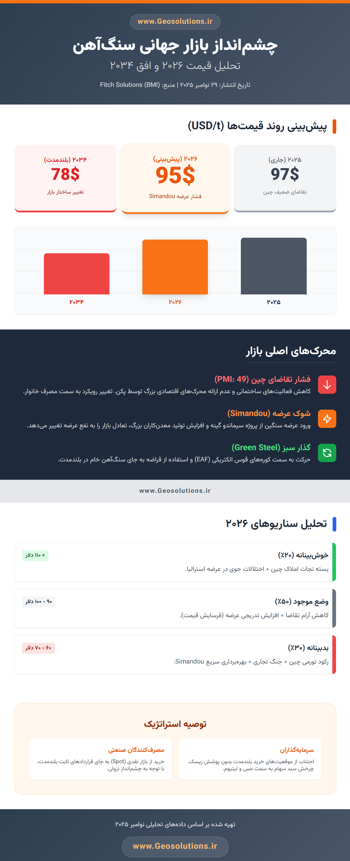 واحد Fitch Solutions (BMI) پیشبینی میکند که قیمت سنگآهن در سال ۲۰۲۶ به میانگین سالانه ۹۵ دلار در هر تن برسد که اندکی پایینتر از ۹۷ دلار در هر تن در سال جاری است. این کاهش ناشی از فشار قیمتها به دلیل ورود عرضه اضافی از پروژه Simandou در گینه است، در حالی که تقاضای داخلی چین به دلیل مشکلات صنعت ساختوساز همچنان ضعیف باقی مانده است.