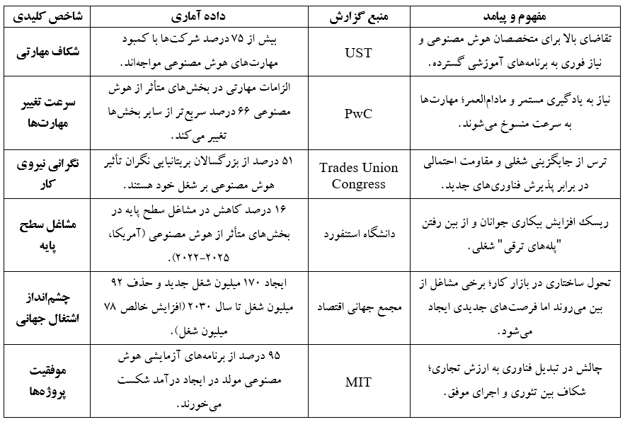 دادههای کلیدی و آماری متن در جدول زیر خلاصه شدهاند تا یک نمای کلی از وضعیت فعلی بازار کار تحت تأثیر هوش مصنوعی ارائه شود: