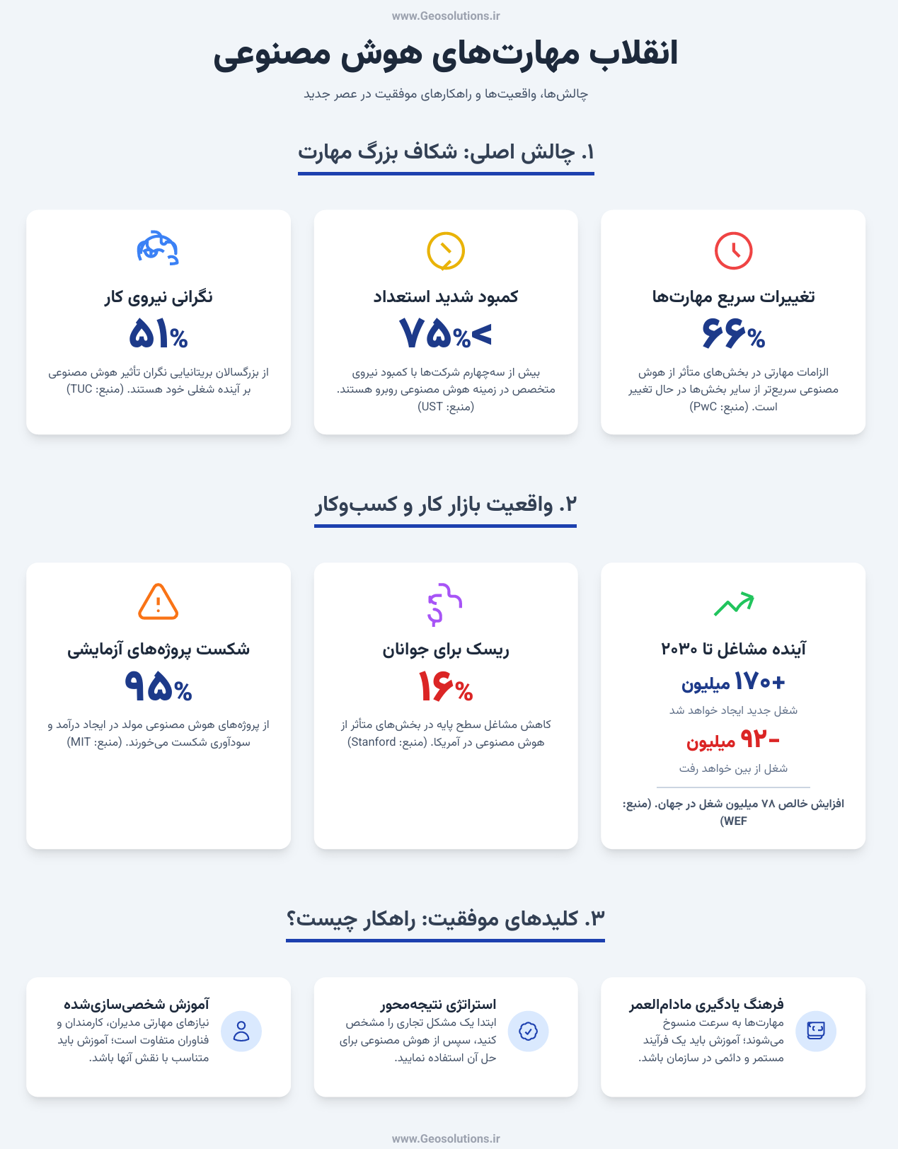 گزارش حاضر به وضوح نشان میدهد که عصر هوش مصنوعی، بیش از آنکه یک انقلاب فناورانه باشد، یک انقلاب در حوزه سرمایه انسانی و مهارت است. تمرکز جهانی از «دسترسی به فناوری» به «توانایی استفاده از آن» تغییر کرده است. ابهام در تعریف «مهارتهای هوش مصنوعی» و سرعت بالای تغییرات، یک محیط پرریسک اما پر از فرصت را برای همه ذینفعان ایجاد کرده است. موفقیت در این دوران جدید، در گرو انعطافپذیری، یادگیری مستمر و اتخاذ رویکردهای استراتژیک و نتیجهمحور است.