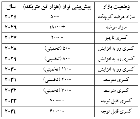 دوره کوتاهمدت (2027-2025): بازار با مازاد عرضه مواجه است که در سال ۲۰۲۶ به اوج خود (حدود ۱۸۰,۰۰۰ تن) میرسد. این وضعیت، که در گزارش به آن اشاره شده، فشار نزولی بر قیمتها را توجیه کرده و دلیل اصلی معاملات در محدوده مشخص است.